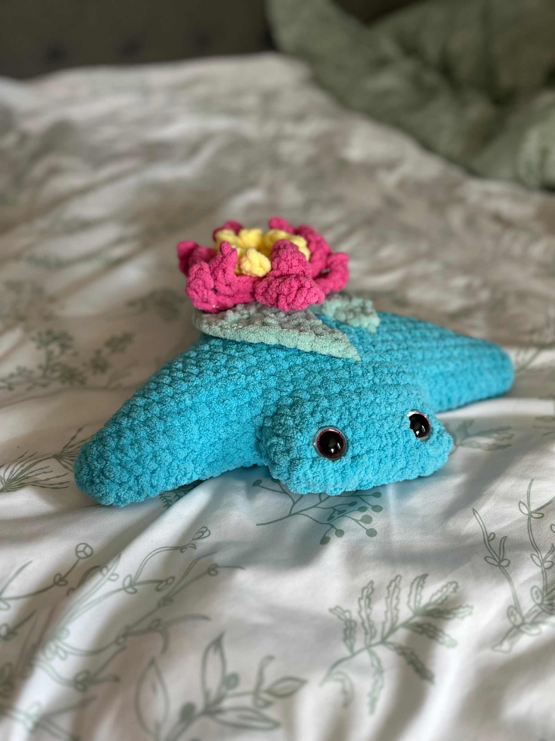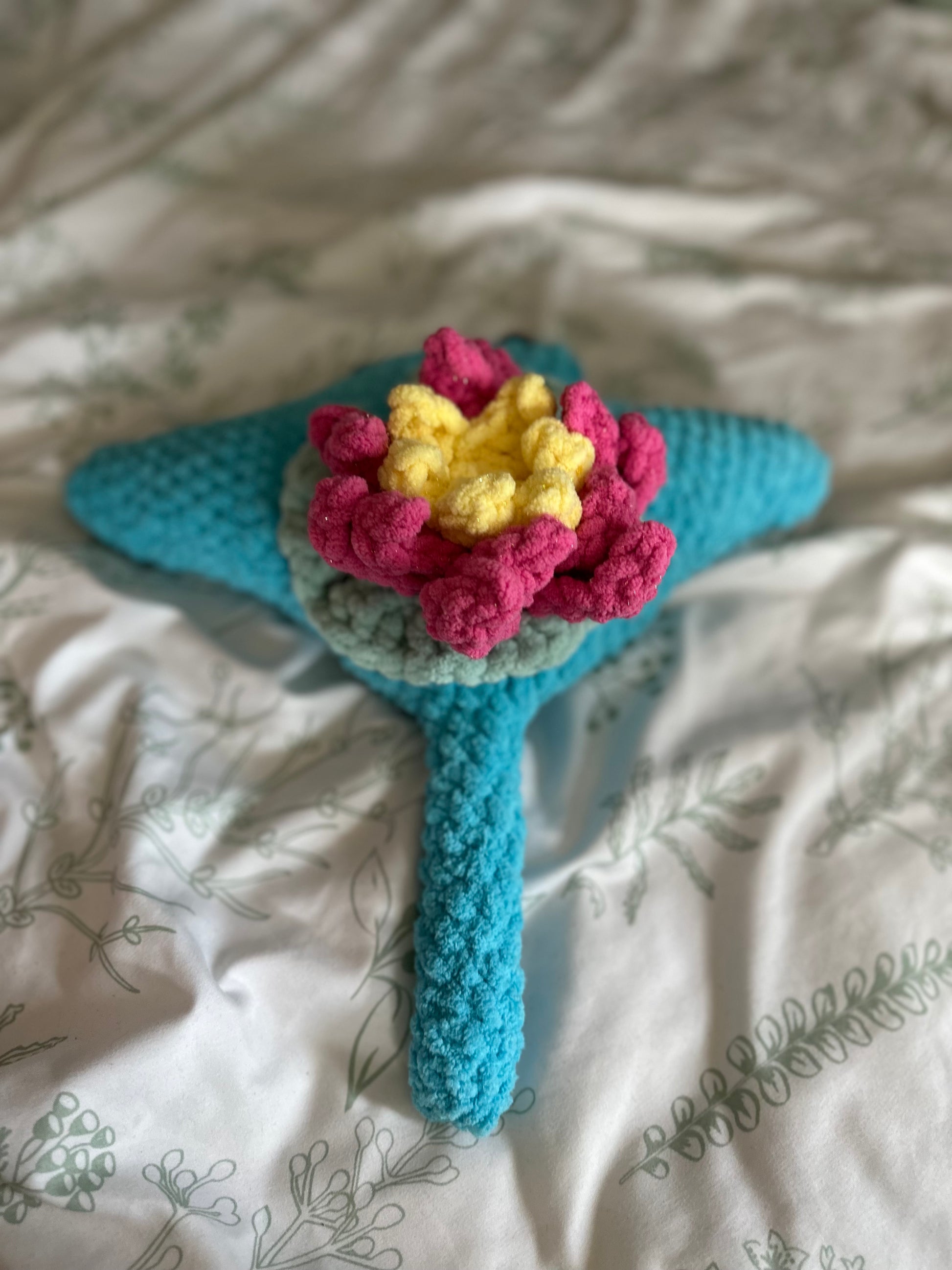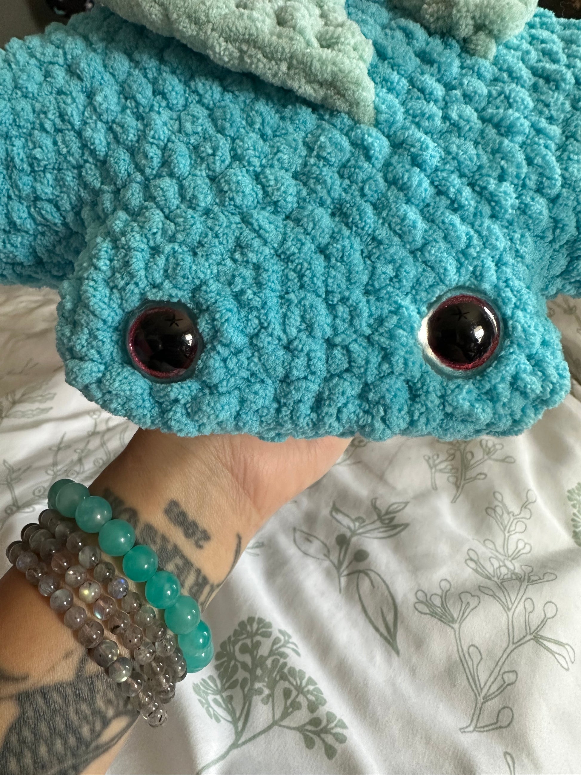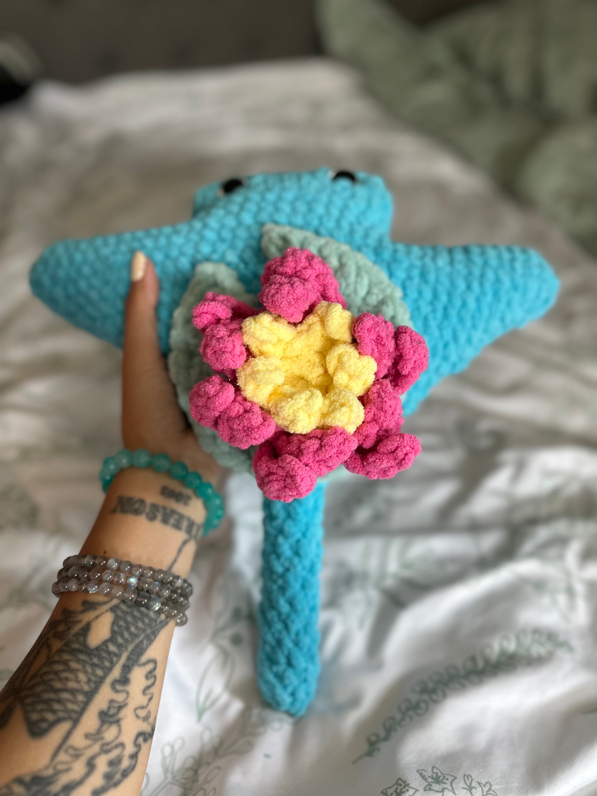 Expertly crafted with intricate crochet detailing, our Lotus Flower Sting Ray is a stunning addition to any collection. Featuring a large size, sparkling pink glitter eyes, and a beautiful lotus flower design, this sting ray is sure to impress. Add a touch of elegance to your space with this unique and eye-catching piece.