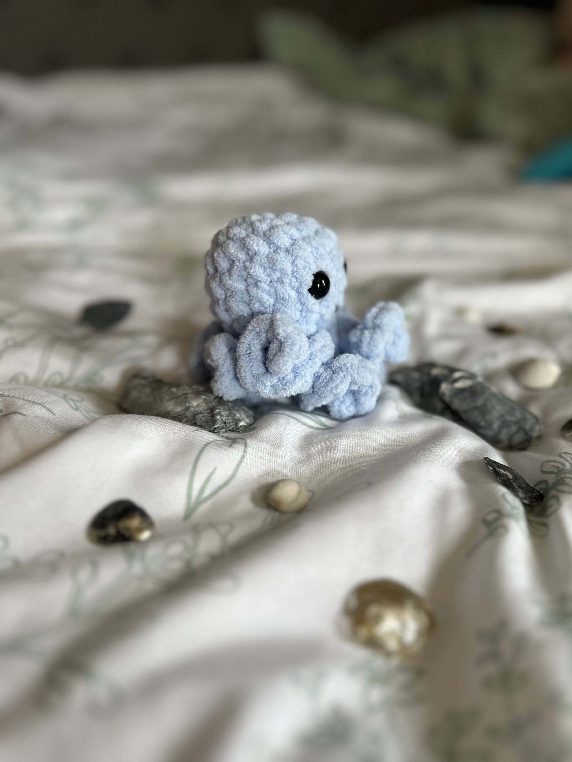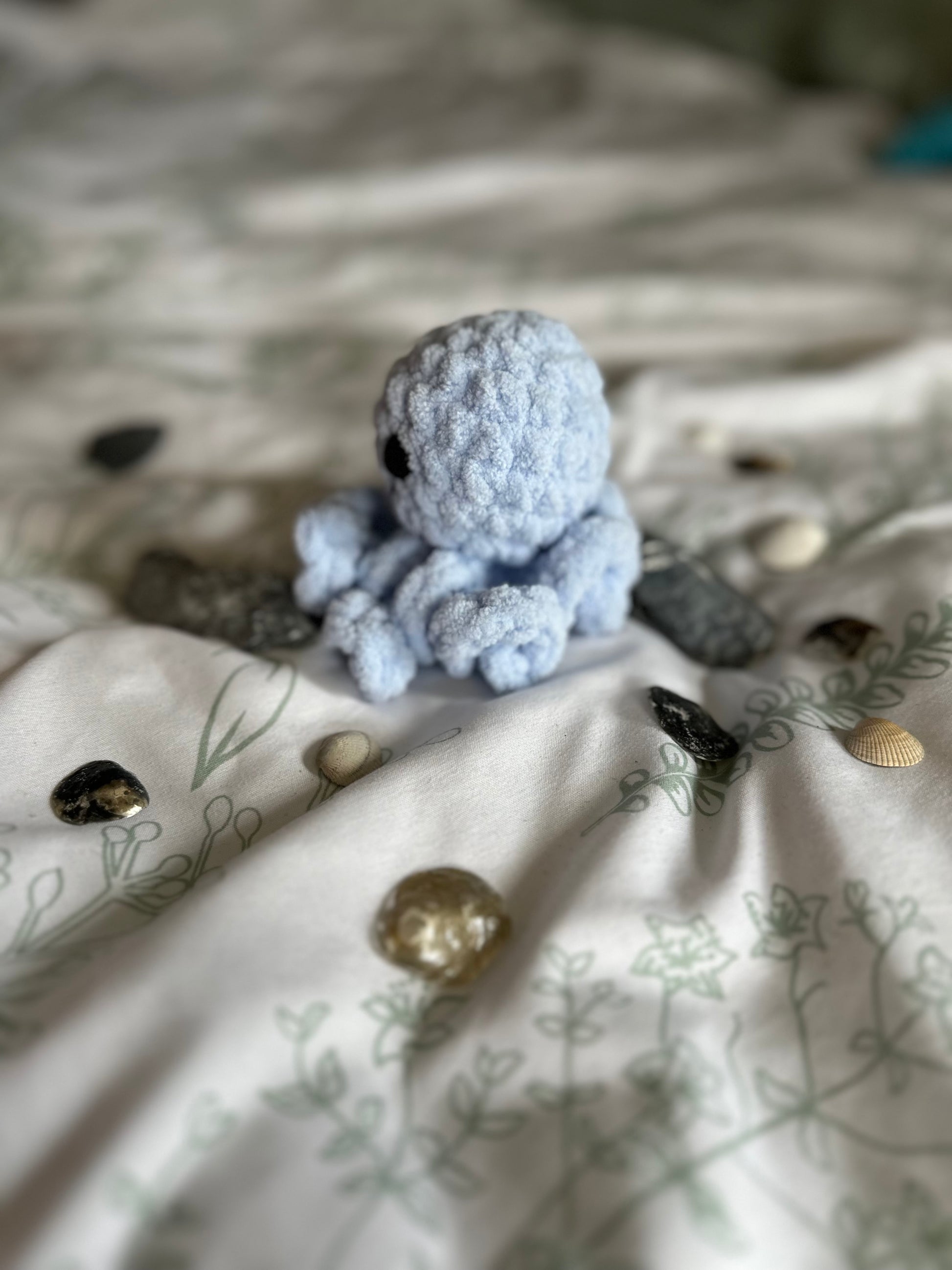 The Octopus is a handmade, crochet toy with a unique light blue color and solid black eyes. Made with love and care, this cute little sea creature will bring joy to anyone who receives it. Its soft material and charming appearance make it the perfect companion for children or adults.